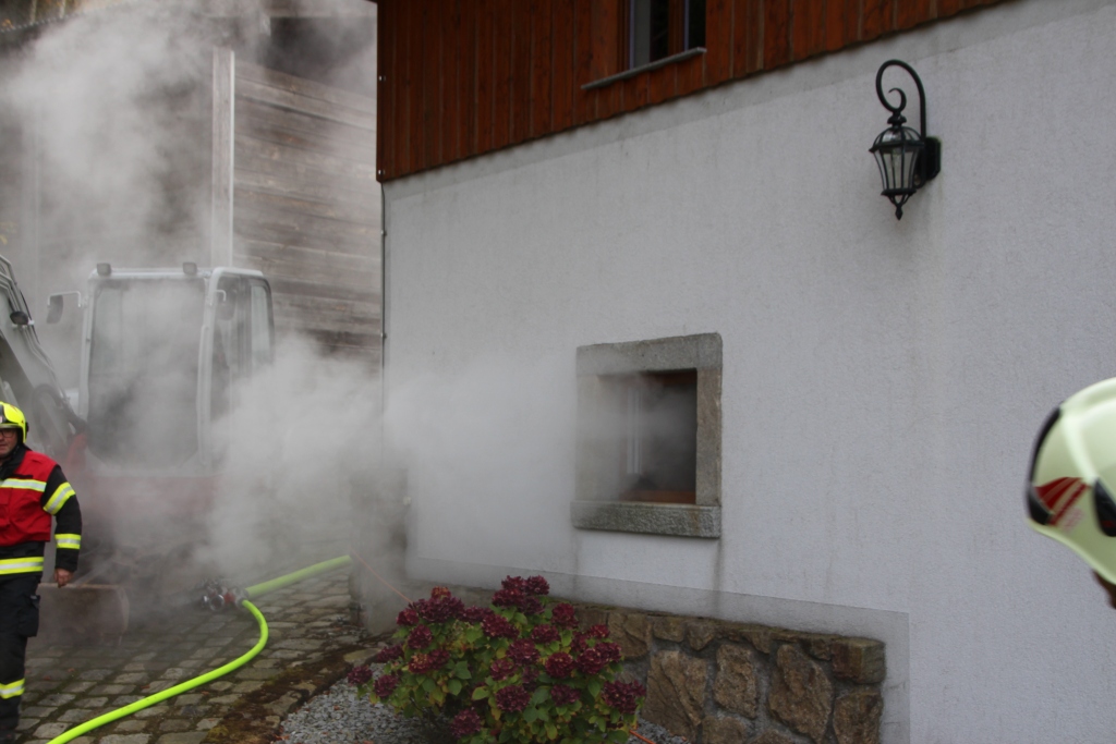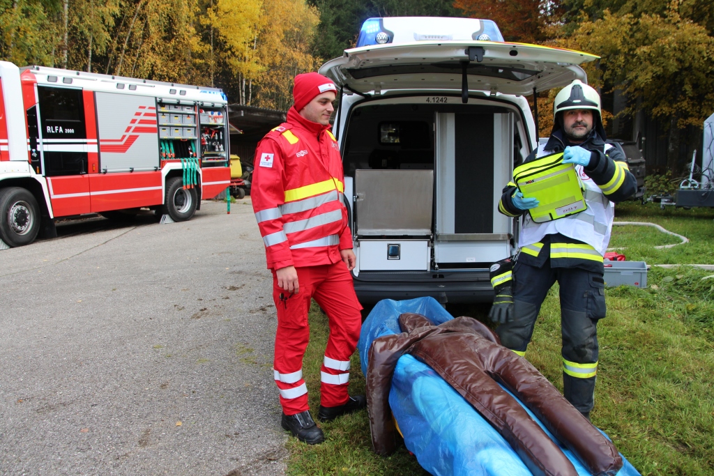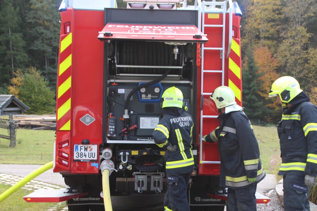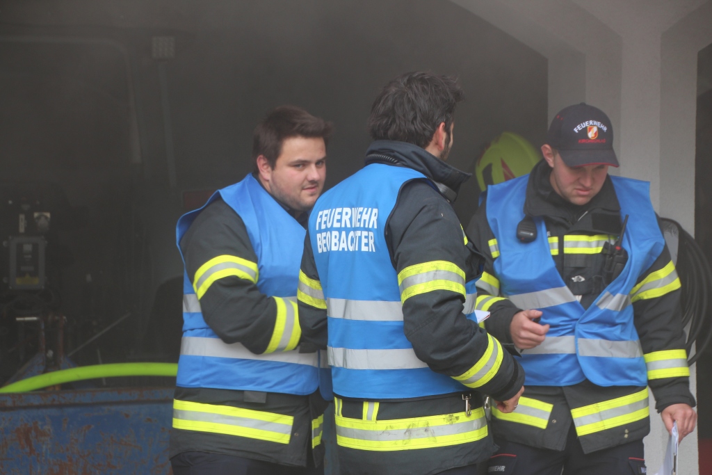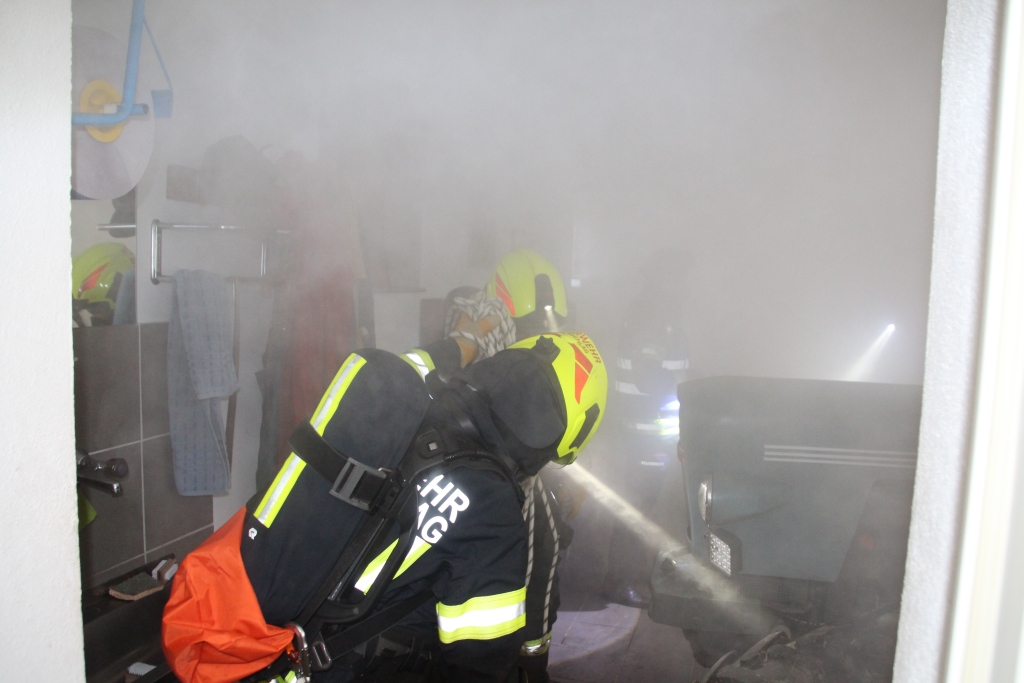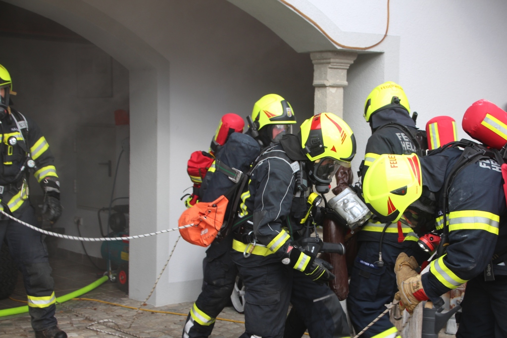 Nach dem Eintreffen stellte sich heraus, dass eine Garage in Vollbrand stand, der Dachstuhl bereits gefährdet war und zwei Personen vermisst wurden. Rasch wurden mehrere Atemschutztrupps eingesetzt, um die Vermissten zu suchen und zu retten. Parallel dazu wurde eine Löschwasserversorgung über längere Strecke aufgebaut, um den Brand effektiv bekämpfen zu können. Dank der guten Zusammenarbeit aller beteiligten Feuerwehren konnte die Übung rasch und professionell abgearbeitet werden.
